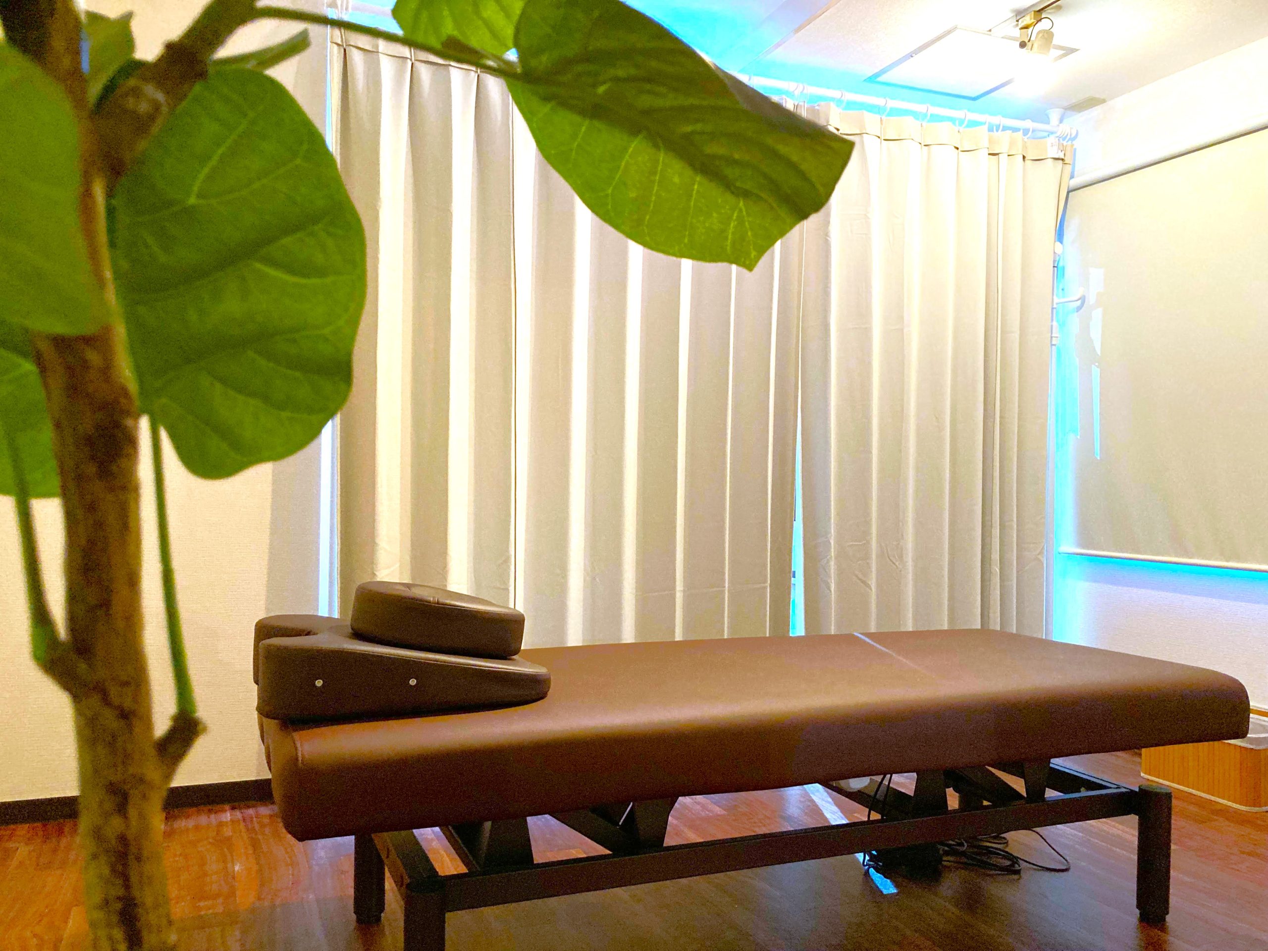 32㎡とワンルームにしては少し広いお部屋です。中央のカーテンで仕切ることにより施術空間を”ちょうどいい広さ”にセパレートすることができ、これが隠れ家や秘密基地みたいで妙に安心する大変好評です。【都会の隠れ家】を是非体感しにきてください。お着換えの際には目隠しにもご利用いただけます。